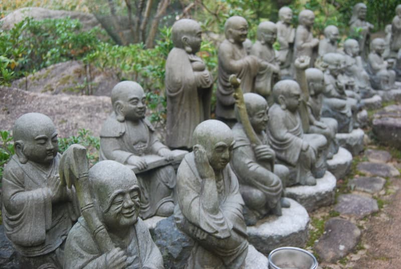 Después andamos un rato y llegamos al templo Daisho in. Es gratis y abre de 8:00 – 17:00h. Un templo muy bonito y curioso por tener un montón de pequeñas estatuas de budas, desde bebé a viejecito en posturas diferentes.