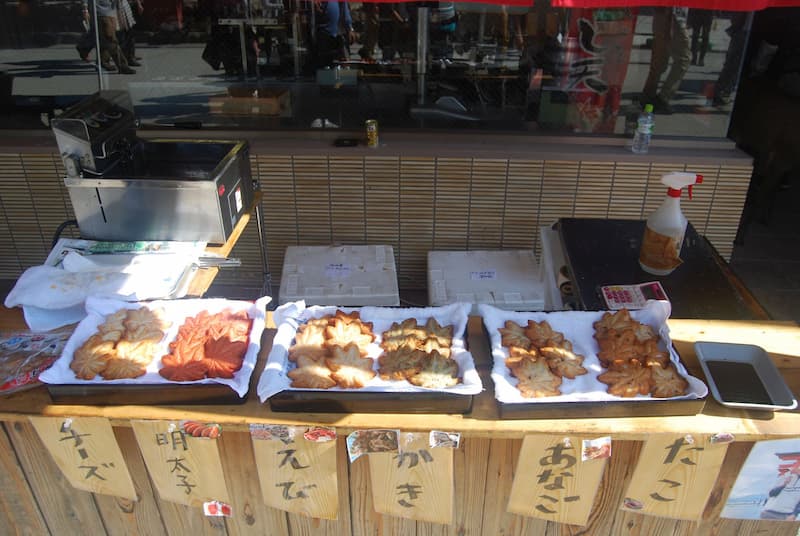 Entonces, para hacer tiempo para ver la puesta de sol y para que bajara la marea, fuimos a ver las tiendecitas de souvenirs. En cada sitio de Japón hay una galleta típica, la de Miyajima es la que tiene forma de arce y suele estar rellena de compota de alubia roja. Vimos como 50 tiendas vendiendo estas galletas, algunas eran recién hechas (artesanales), otras rellenas de mil sabores ¡muy ricas todas!