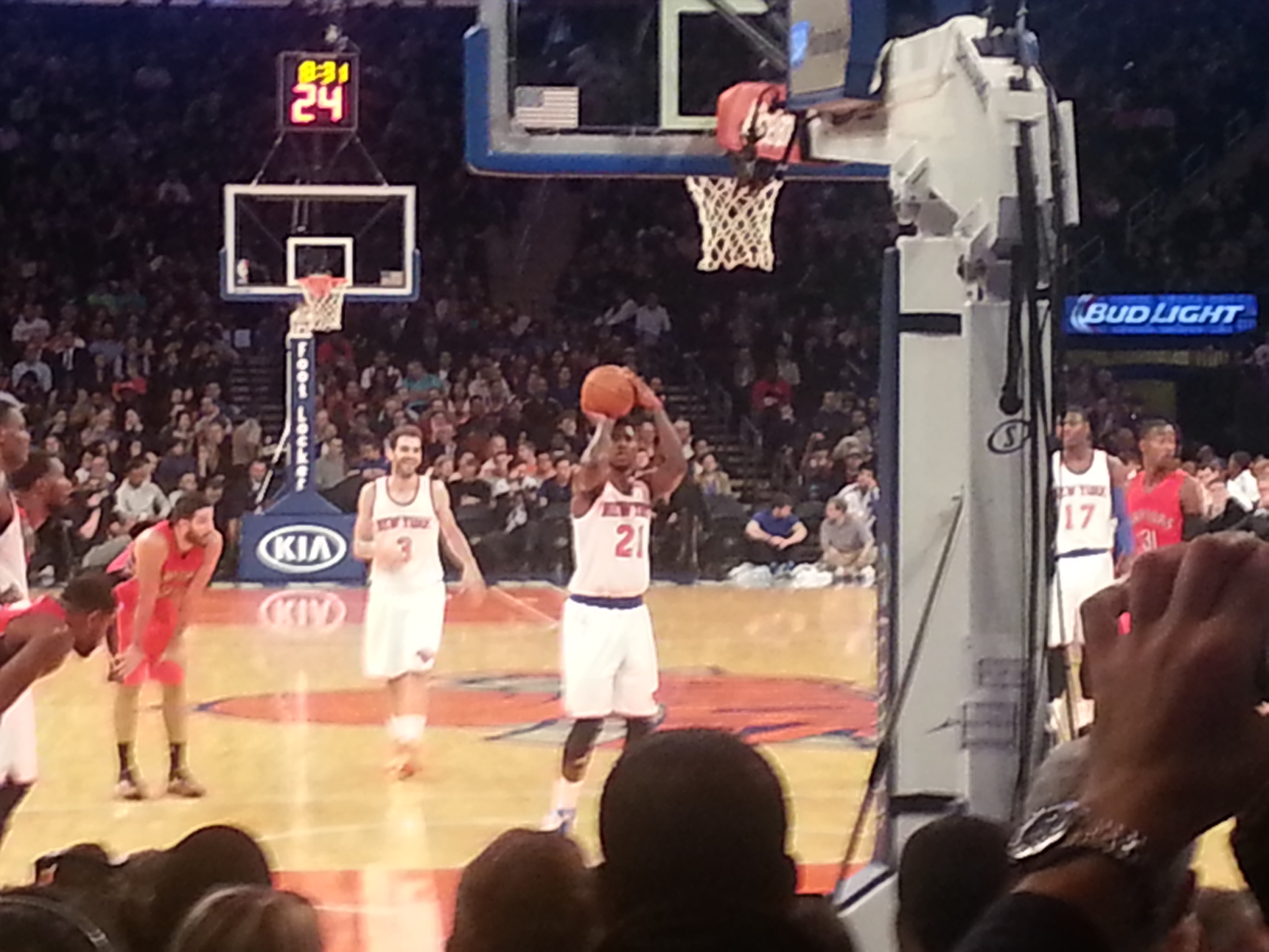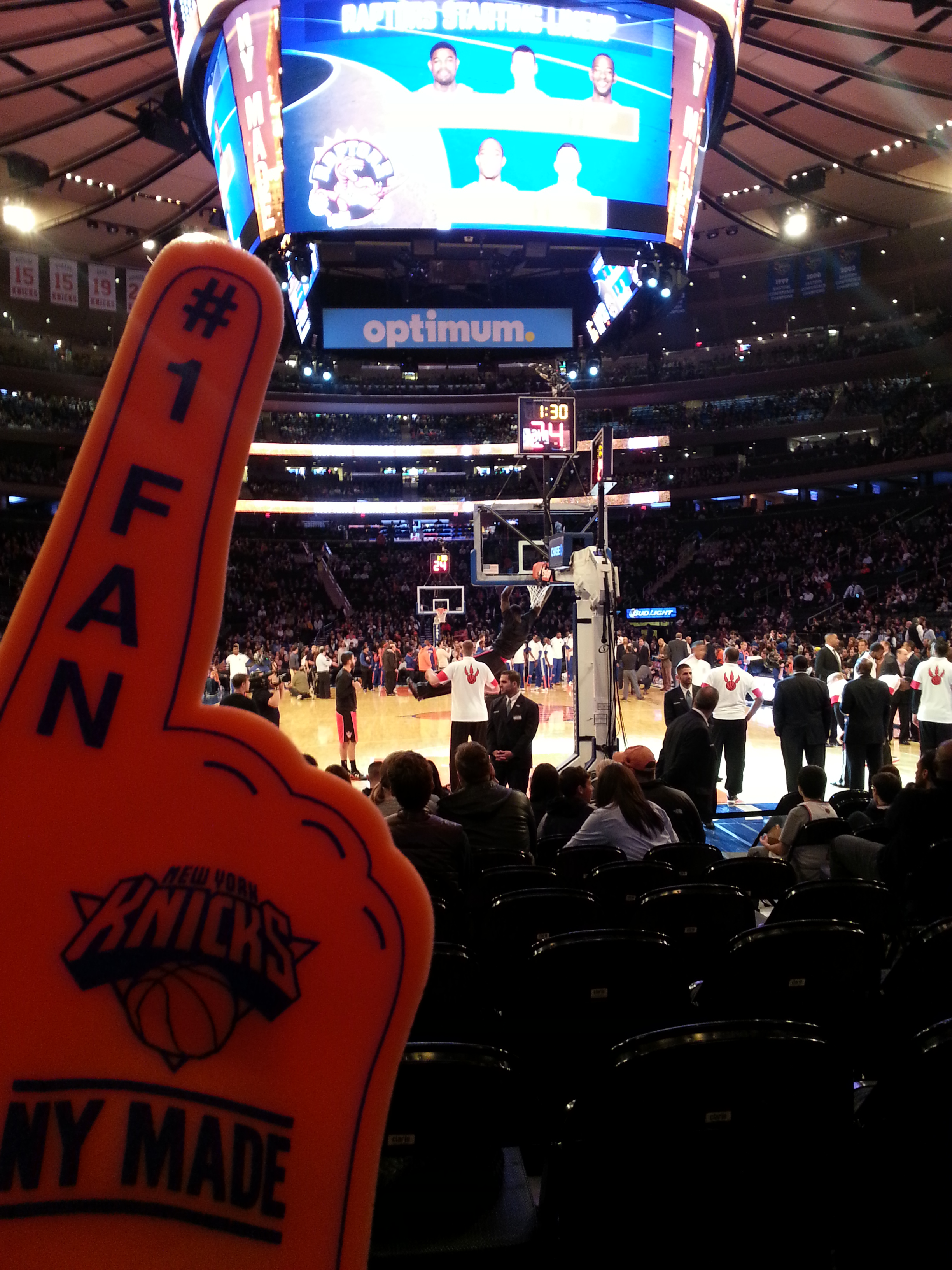 La verdad es que fue una experiencia genial, a pesar de ser un partido amistoso. Nos compramos una camiseta y una mano gigante y ¡disfrutamos del show! Salieron las cheerleaders y vimos a los jugadores muy de cerca, además era la noche latina y había un dj que ponía música. También hicieron concursos de tiros libres y todo lo que se suele ver por la TV.