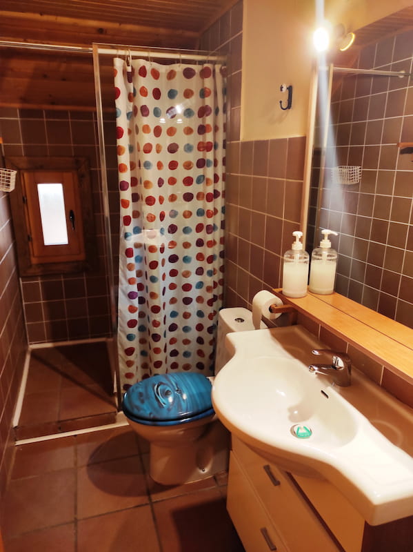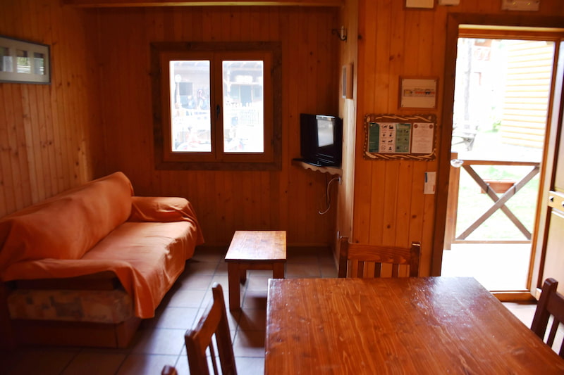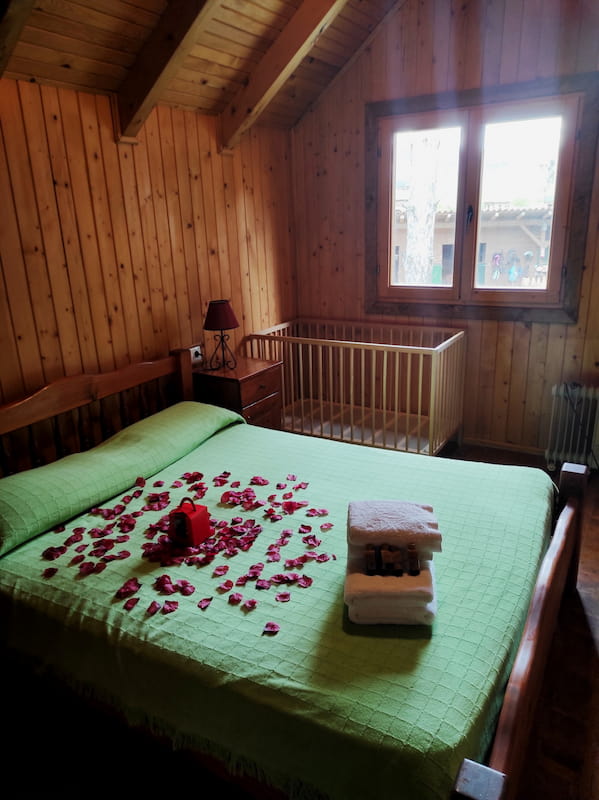Nosotros pudimos dormir en una cabaña de madera preciosa de 2 pisos. Las hay de distintos tamaños, pero la nuestra tenía capacidad para 6 personas: una cama de matrimonio, 2 individuales y un sofá cama. También disponen de cuna, si la necesitas.